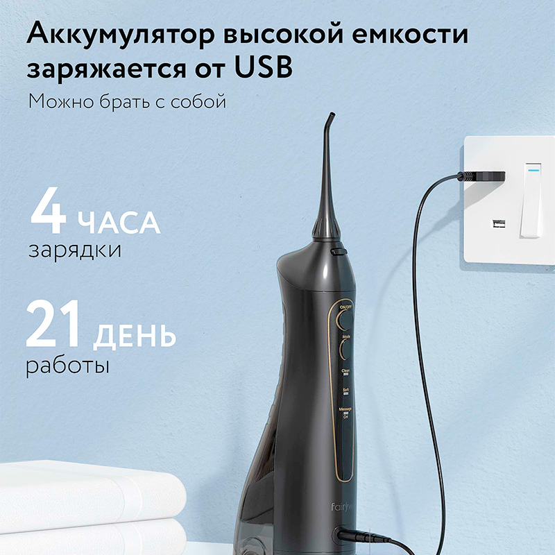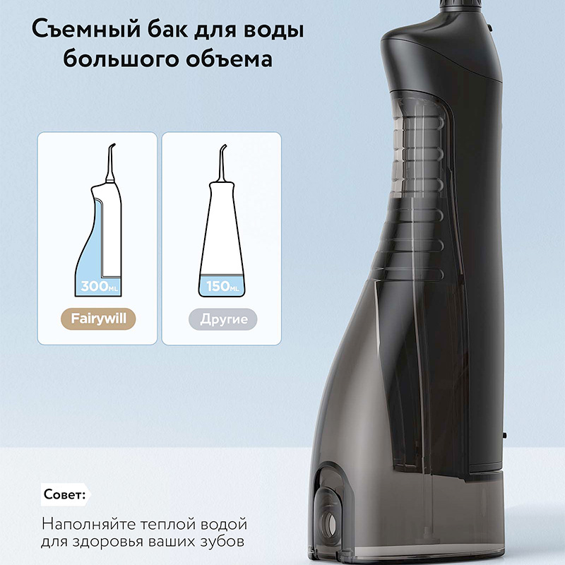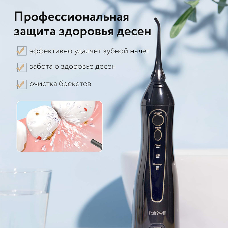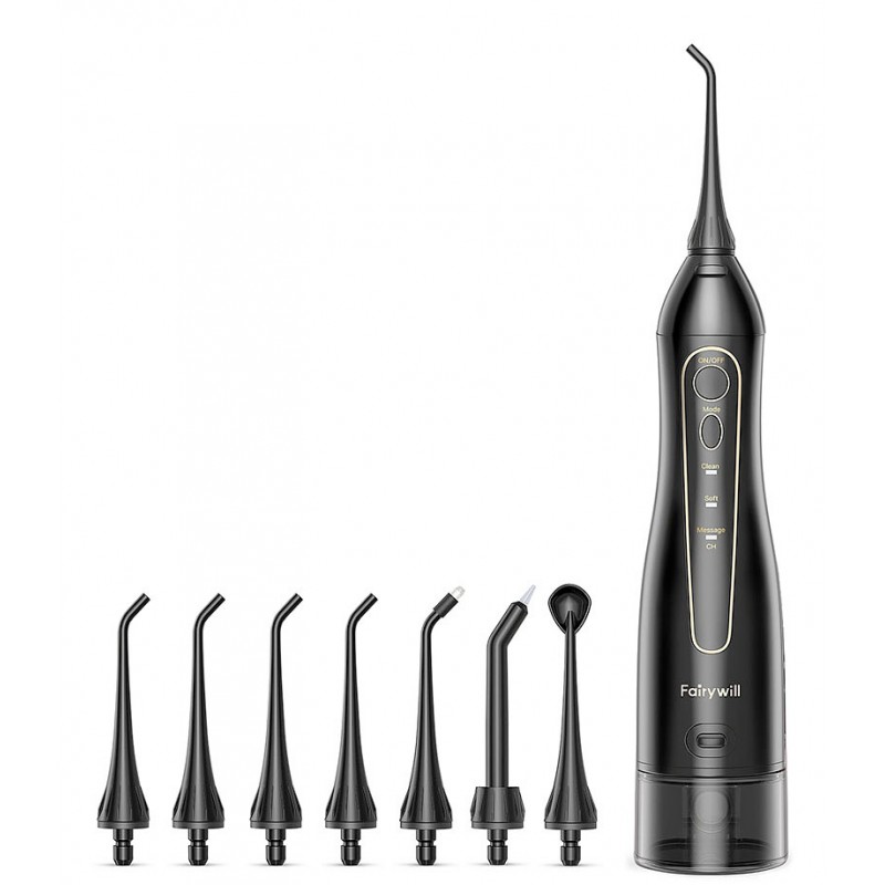 Ирригатор Fairywill F5020E черного цвета — это компактный, надежный и эргономичный прибор, который удобно брать с собой в поездку и использовать каждый день.