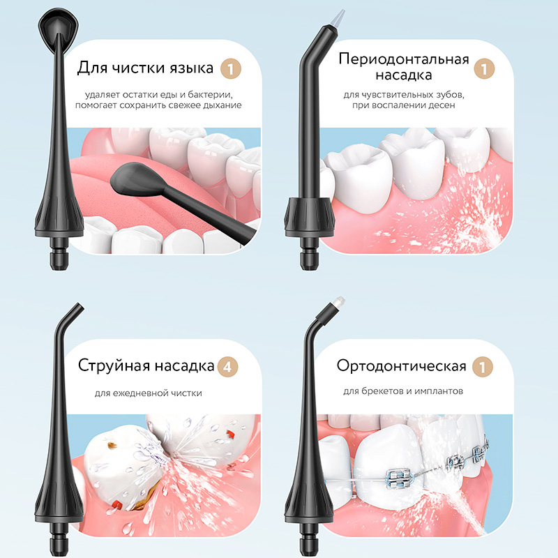 Насадки | струйная (4 шт), для очистки языка (1 шт), ортодонтическая насадка (1 шт), периодонтальная насадка (1 шт) |